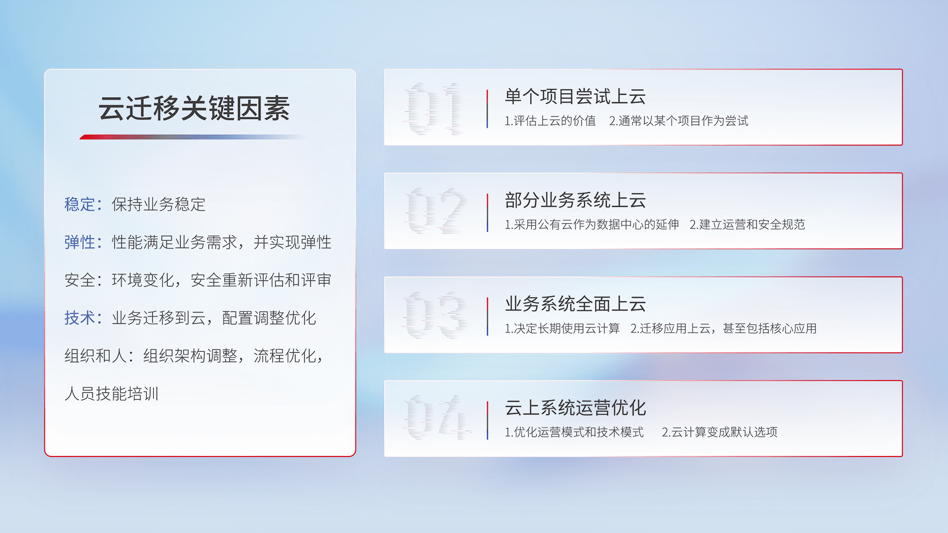 结合实际业务,,,从规划设计、、、、云平台选型、、云原生改造、、数据迁移、、集成交付,,迁移全过程为客户识别最佳上云路径,,,,做好风险识别管理,,,,设计网络架构、、、、身份权限、、安全审计合规、、、操作审计、、、、日志审计、、监控告警策略、、、、多站点容灾设计等,,对云上基础设施进行整体规划,,,提升IT治理水平,,,以满足弹性、、、、高可用、、、、高性能的需求。。。。